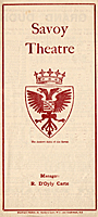 A survey of the career of D'Oyly Carte and his company, this archive page has a complete list of productions at the Savoy Theatre during his management, including cast changes and variant programme covers where illustrations are available. Also, details of productions prior to the opening of the Savoy and of some of the early touring companies. Items are listed in approximate date order, according to the printing date of the item (where known). Most items on this page are not currently for sale. Early items for sale can be found here. |